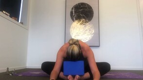 Set your bolsters & blocks up as shown in the picture or place a rolled blanket on the mat. Bring you buttocks up to the edge of the bolster & allow your body to gently fall over the bolster, arms to your side, chin slightly tucked in towards your chest to lengthen through the neck.