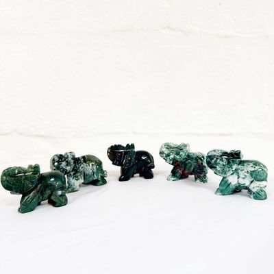 These beautifully carved Moss Agate elephants bring together the wisdom of the elephant spirit with the earthy, nurturing energy of the stone. Each piece carries its own unique landscape of forest-like patterns, swirling greens, soft whites, and natural inclusions that look like tiny worlds suspended inside the crystal.