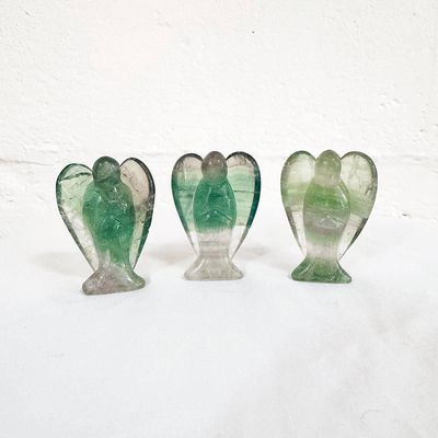 Carved from rainbow fluorite, these angels shimmer with bands of purples and greens, each layer a natural reminder of harmony and inner guidance. Fluorite is known as the “clarity stone,” helping to quiet mental chatter, strengthen intuition, and bring order to scattered thoughts.