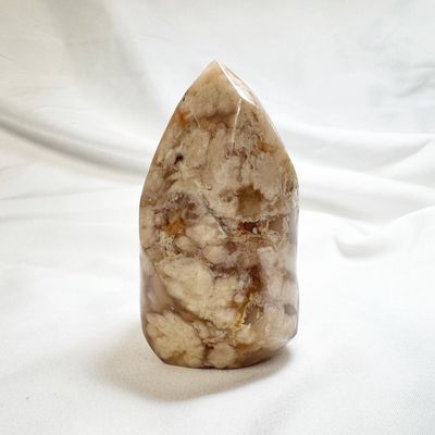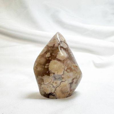 Shaped into a flame, this stone symbolises the spark of life within...... the steady, rising energy that fuels change, creativity, and forward movement. These flames are beautiful companions for intention setting, new chapters, or simply bringing a sense of hope and possibility into your space. Each one is completely unique, carrying its own natural blossoms and gentle energy.